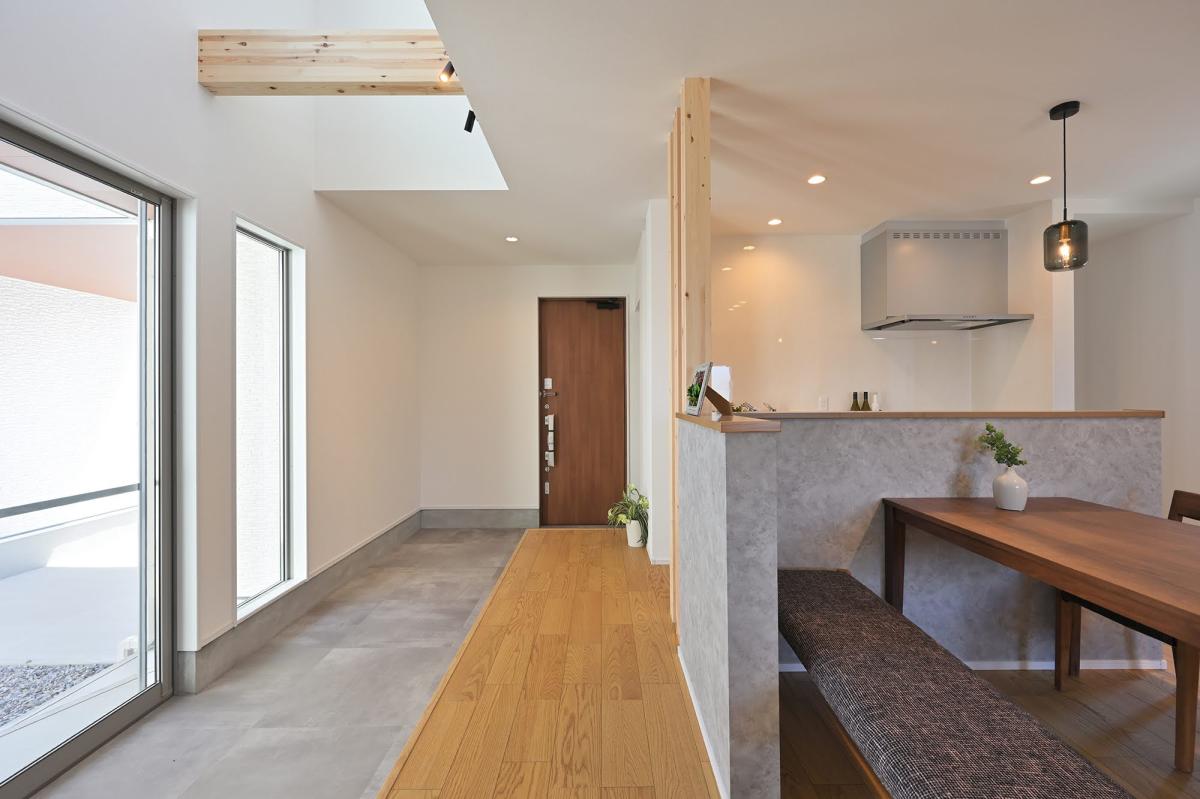 玄関を開けるとすぐ土間→LDKとなっており、吹き抜けの玄関は開放的で空間を広く見せてくれます。